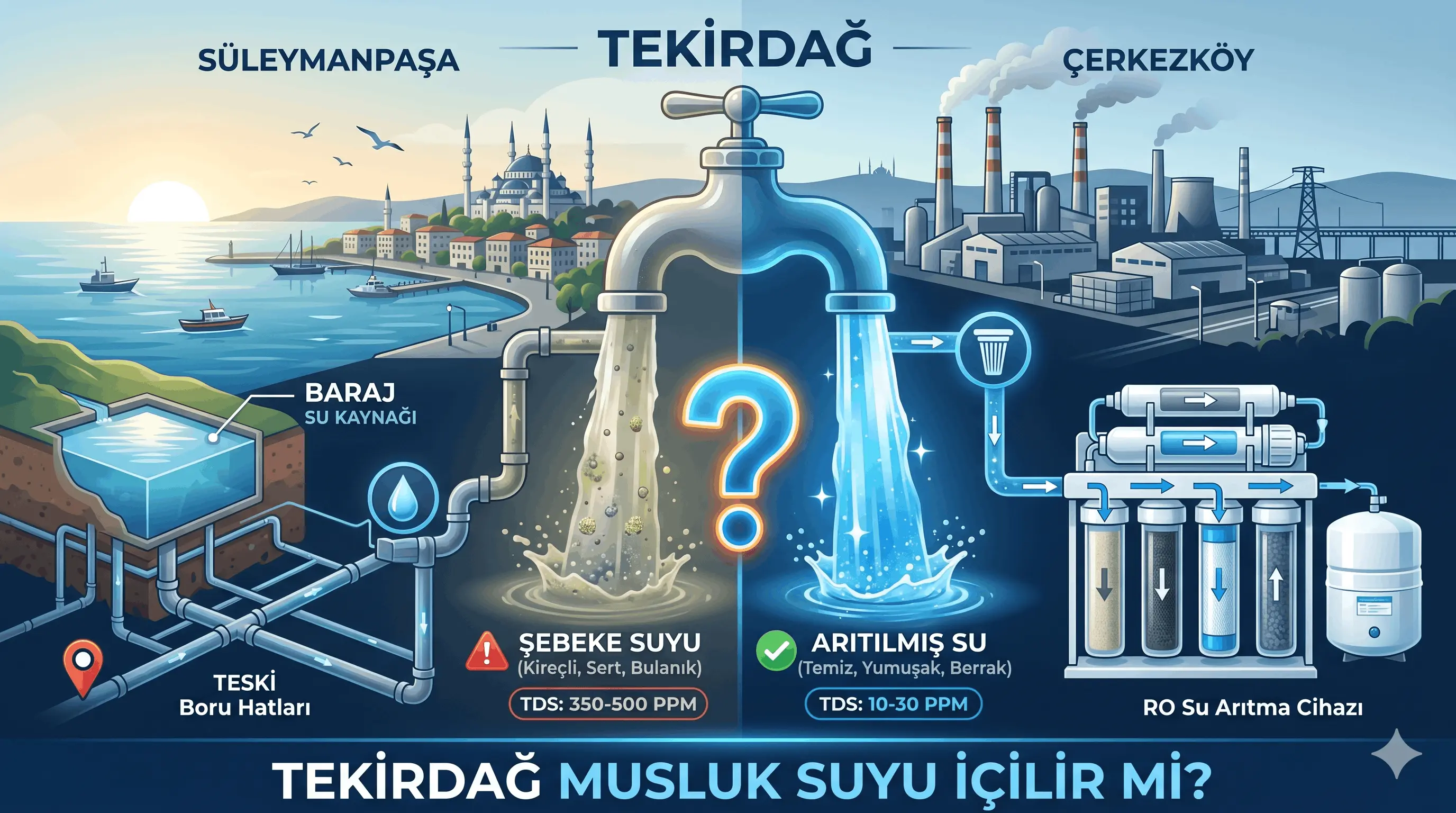 Tekirdağ şebeke suyu resmi verilere göre büyük ölçüde içilebilir standarttadır; ancak boru yaşı, ilçe ve bina altyapısına bağlı olarak risk düzeyi değişmektedir. Özellikle Çorlu ve Çerkezköy'de ihtiyatlı bir yaklaşım benimsemek ve arıtma cihazı kullanmak önerilmektedir.